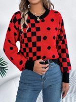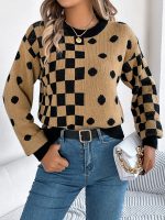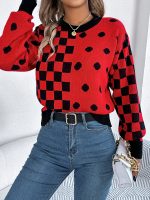 Women Casual Color Block Polka Dot Plaid Lantern Sleeve Pullover Sweater
