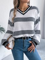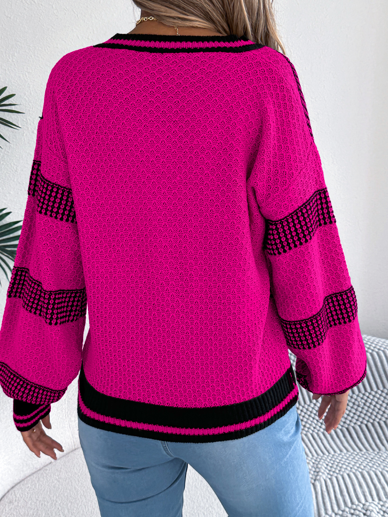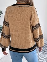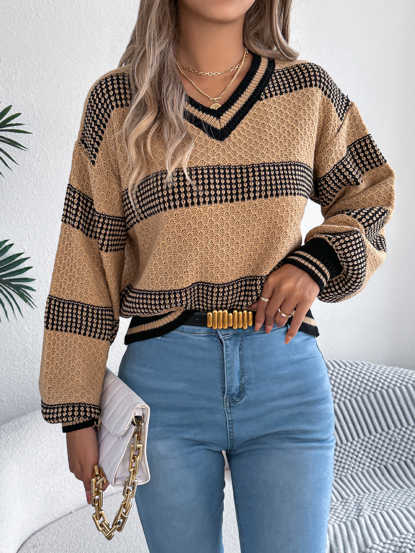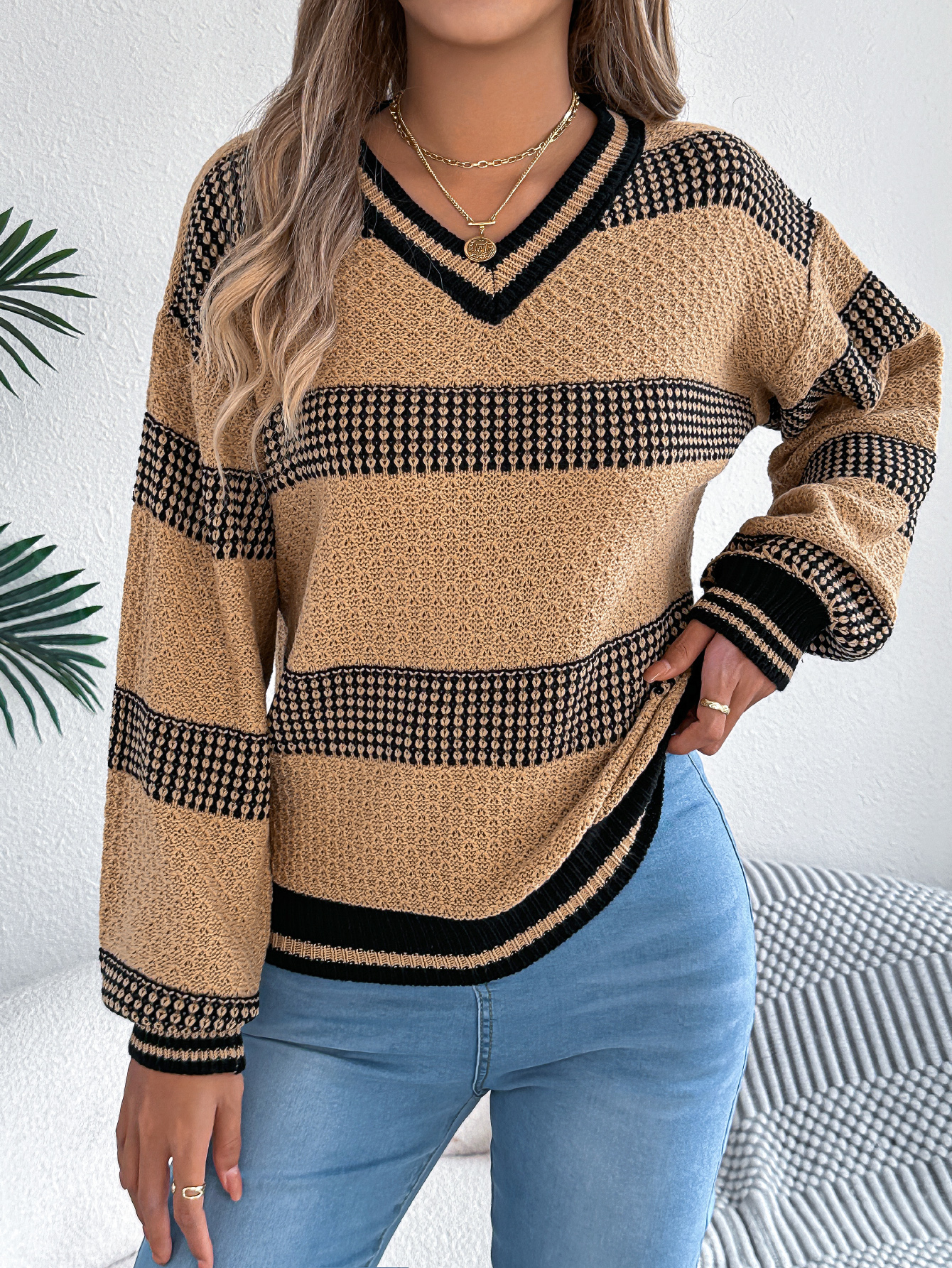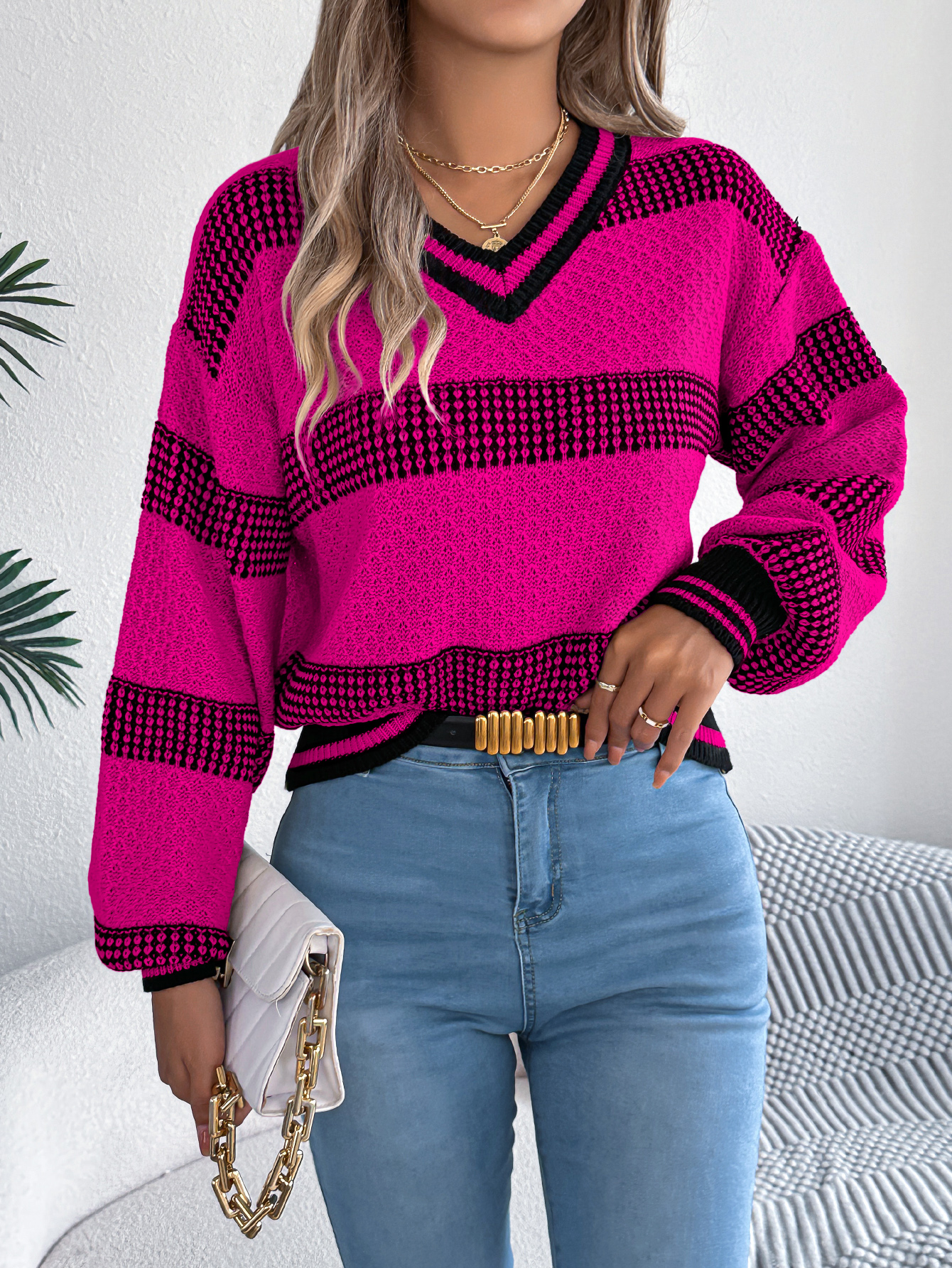 Stylish women’s pullover sweater featuring a V-neck, color block stripes, and lantern sleeves for a comfortable and trendy look.