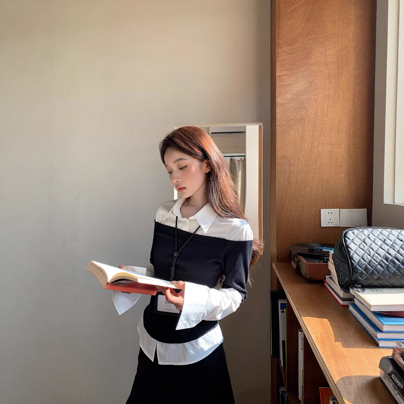 Stylish women’s autumn shirt featuring a Korean slim fit with a flattering fake two-piece design for a sleek silhouette.