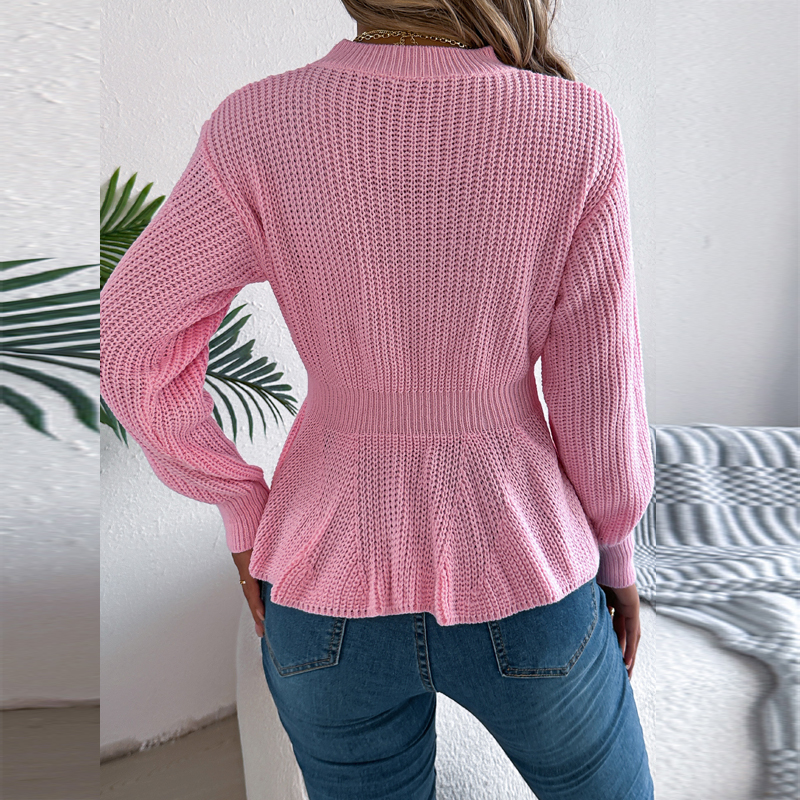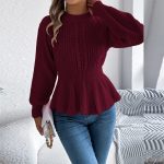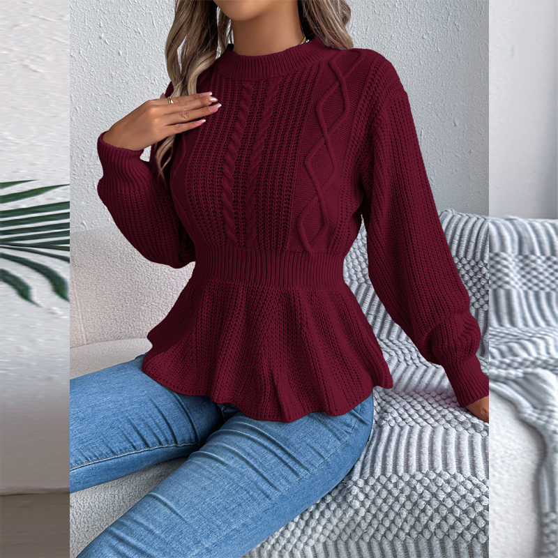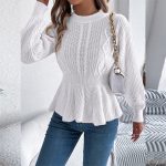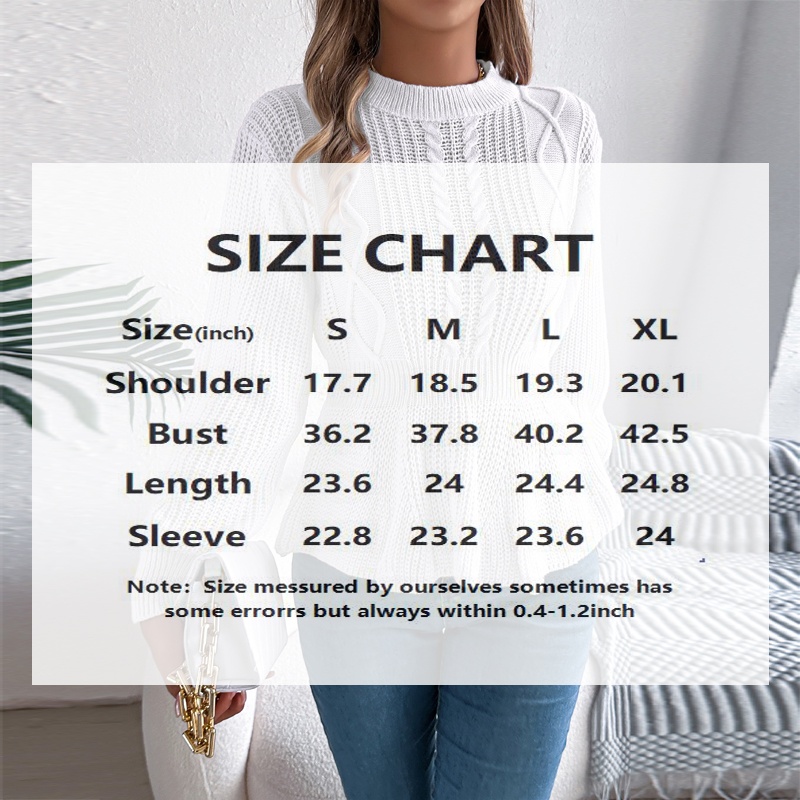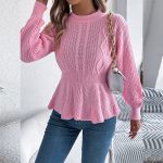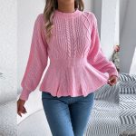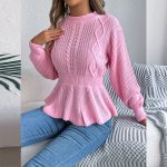 Stylish women’s cable knit sweater featuring a peplum hem, round neck, and ribbed waist, perfect for spring and fall seasons.