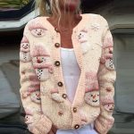 Festive women’s cardigan featuring unique cartoon Christmas patterns, perfect for holiday seasons and casual winter wear.
