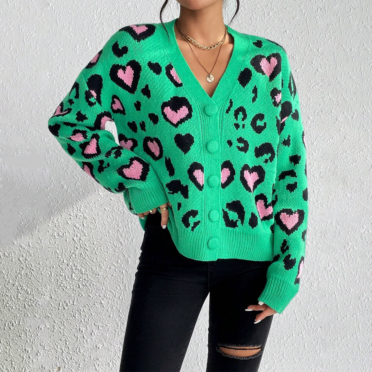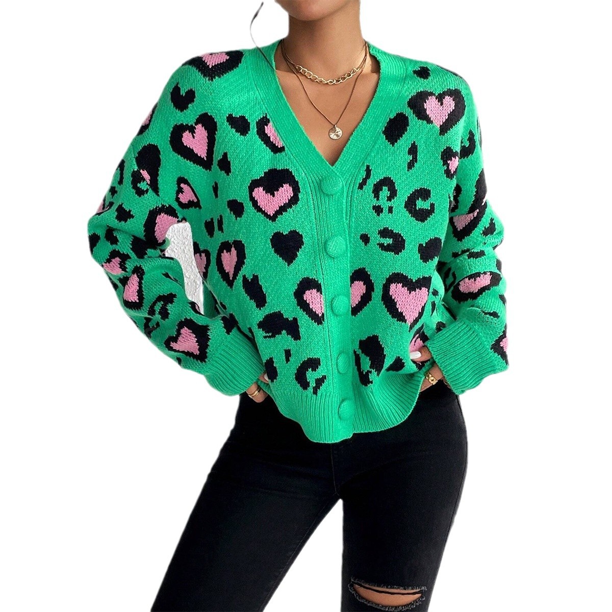 Stylish women’s jacquard knit sweater coat featuring colorful leopard design. Comfortable, warm, and perfect for casual or dressy occasions.