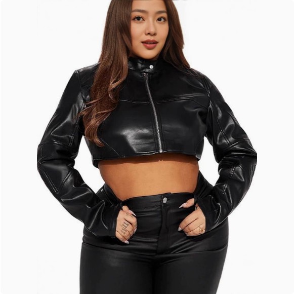 Stylish women’s cropped biker leather jacket featuring solid color contrast and front zipper closure for a modern, edgy look.