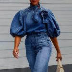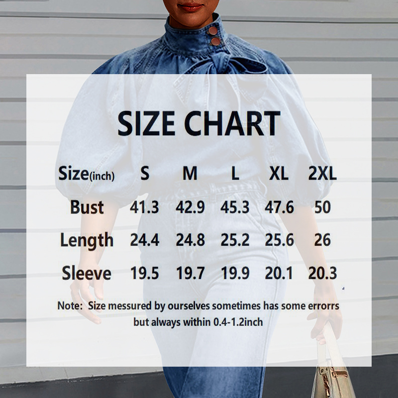 Be the first to review “Women’s Denim Puff Sleeve Top Solid Color Stand Collar Blouse With Bow Detail For Spring And Fall” Cancel reply