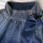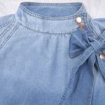 Stylish women’s denim top featuring puff sleeves, stand collar, and bow detail, perfect for spring and fall seasons.