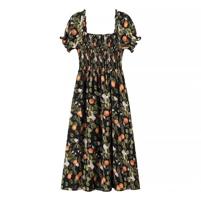 Stylish women’s dress featuring an elastic waist and vibrant print, perfect for urban street fashion and comfortable wear.