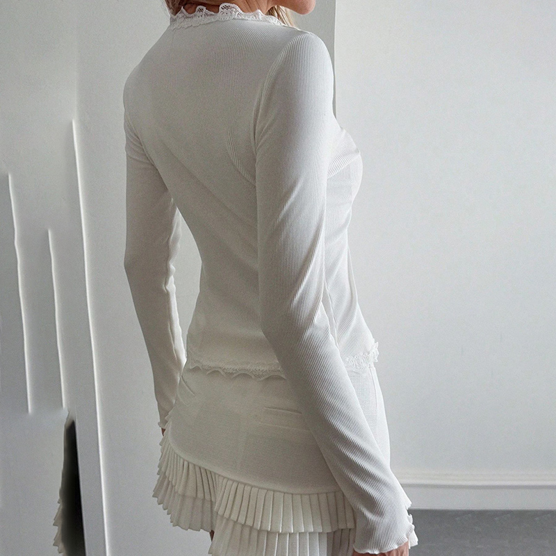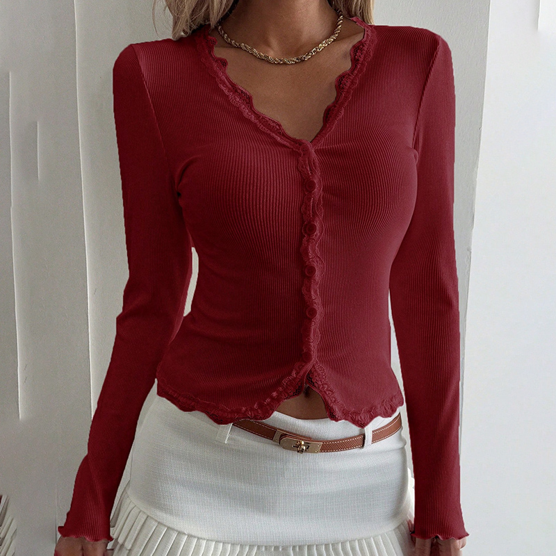 Elegant women’s blouse featuring lace trim, V-neck, ruffle accents, and button-down design for spring and fall seasons.