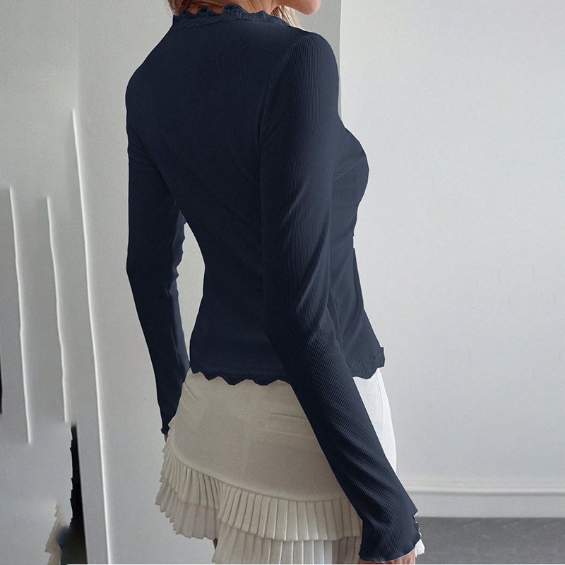 This women’s blouse showcases a refined design with delicate lace trim along the V-neckline and ruffle details that enhance its elegant silhouette. Crafted for transitional weather, the long sleeves provide comfortable coverage, while the button-down front offers versatile styling options. Ideal for spring and fall wear, this blouse combines sophistication with subtle feminine accents, perfect for both casual and formal occasions.