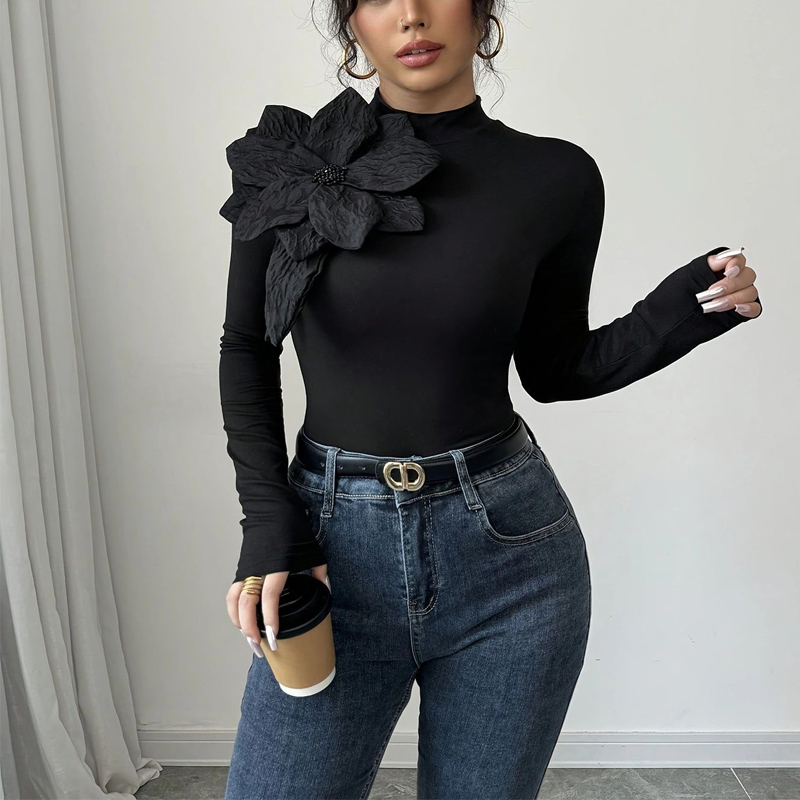 Sophisticated women’s knit top featuring 3D floral rhinestone decoration, high neck, and long sleeves in a solid color design.