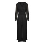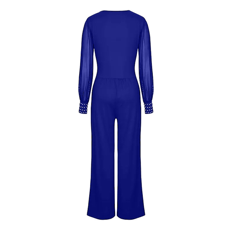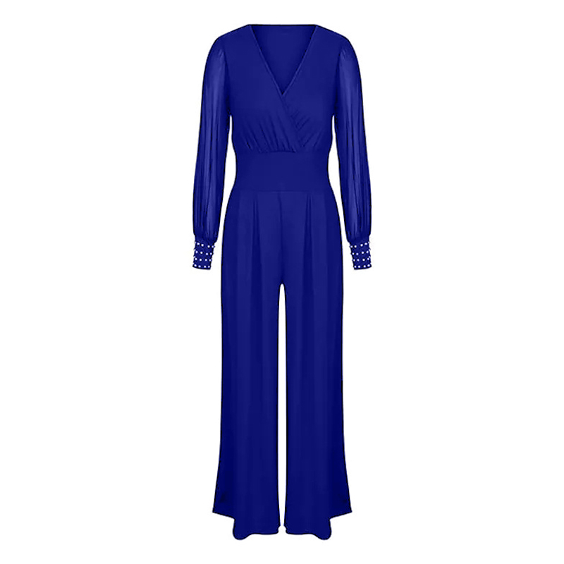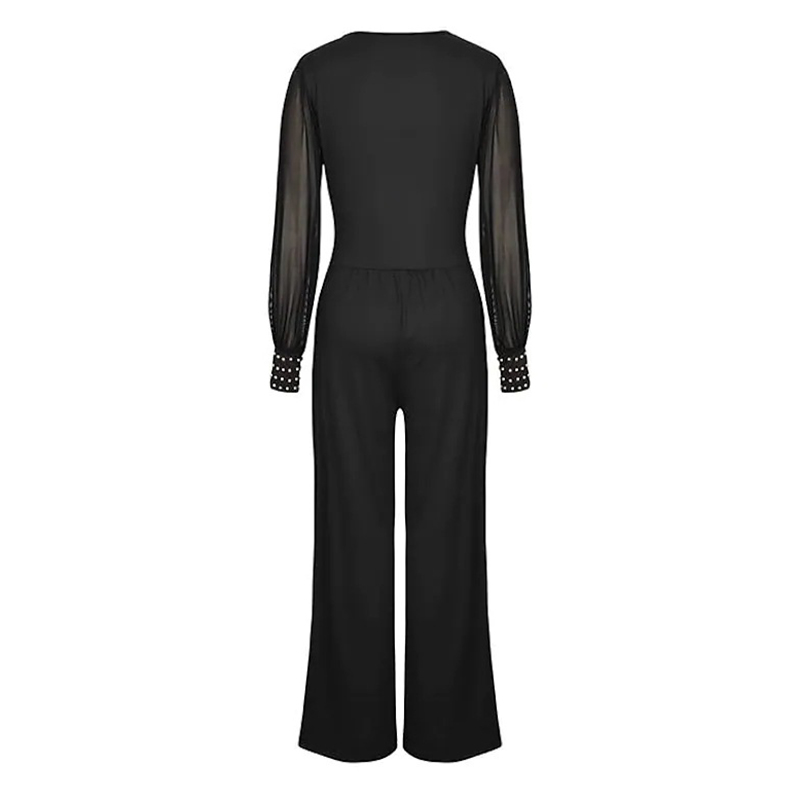 This women’s romper combines elegance with comfort through its V-neck design and sheer mesh long sleeves. Crafted for a loose, relaxed fit, it features wide-leg trousers that enhance movement and style. The rivet accent cuffs add a sophisticated detail, making this jumpsuit ideal for parties and formal occasions. Its breathable material ensures comfort throughout extended wear, while the high-quality construction preserves its shape and appearance. The romper exemplifies modern fashion with a versatile design suitable for evening events or casual chic gatherings.
