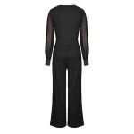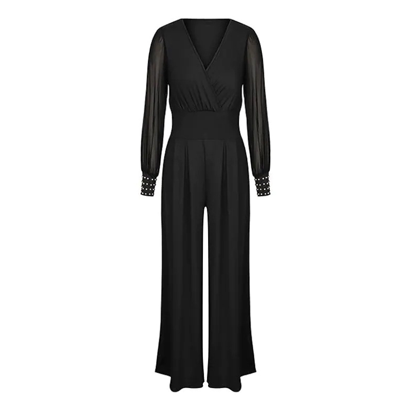 Stylish women’s romper featuring a V-neck, mesh long sleeves, loose fit, wide legs, and rivet cuff details for party wear.