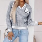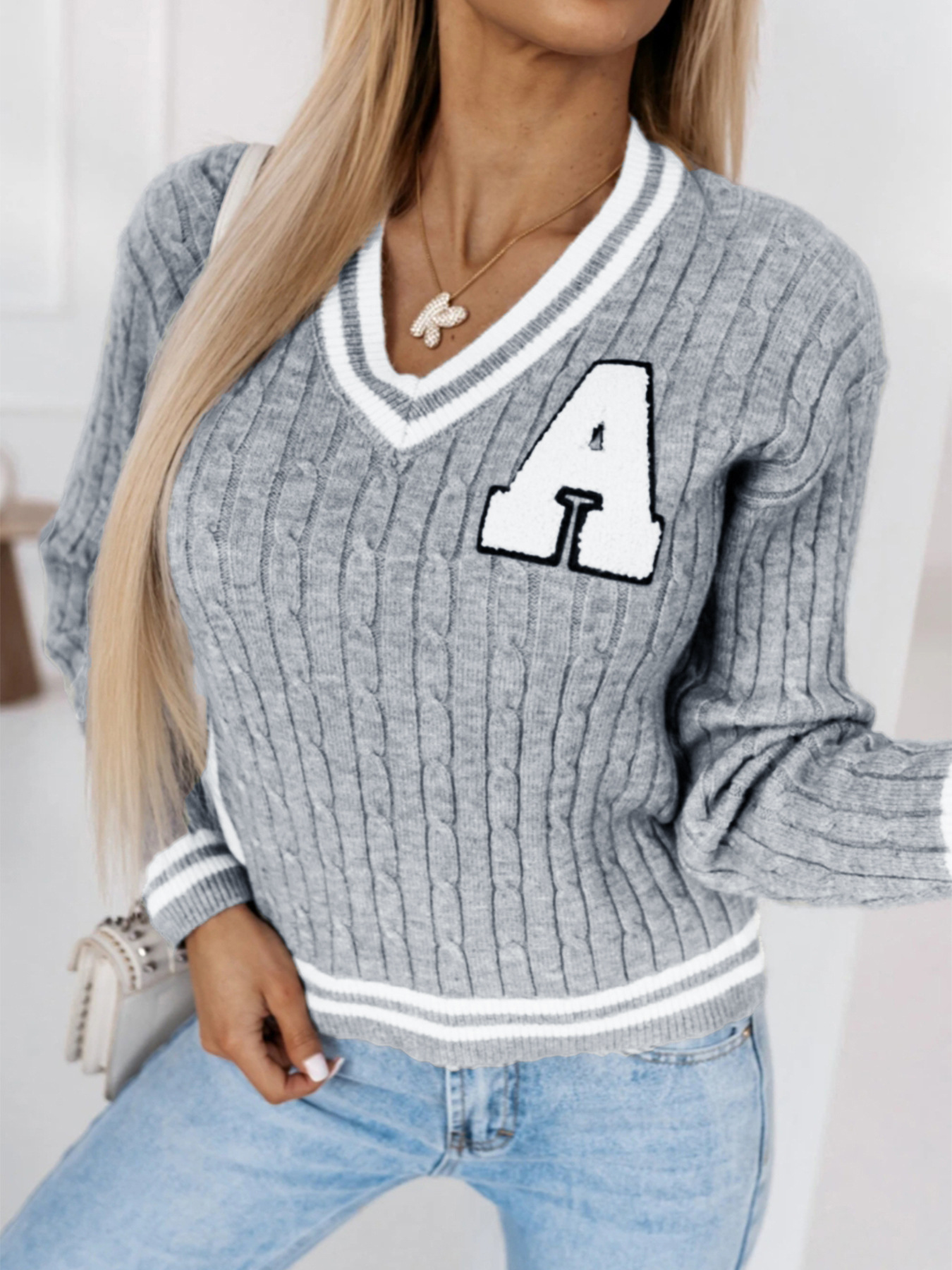 Stylish women’s V-neck pullover sweater featuring letter design, blending European and American fashion for versatile casual wear.