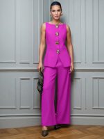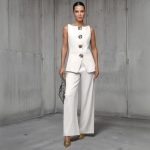 Stylish women’s casual suit featuring a golden button vest and matching pants for a fashionable, versatile look.