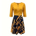 This women’s A-line midi dress showcases a stylish geometric print, designed to offer a flattering silhouette. It features a semi-zip neckline and long sleeves, combining comfort with contemporary elegance. The included belt accentuates the waist, enhancing the dress’s shape. Ideal for spring and summer seasons, this fashion dress embodies both sophistication and practicality, perfect for various occasions.