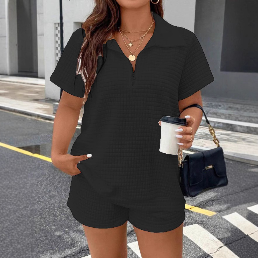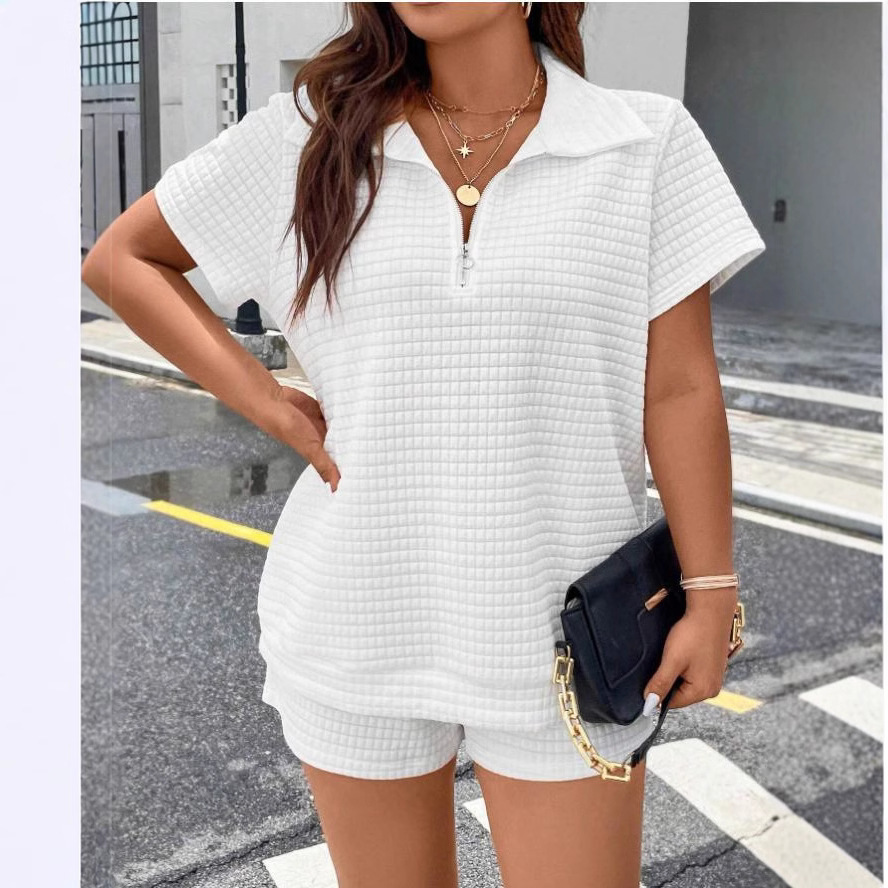 Tags: breathable casual wear, casual textured clothing, casual two-piece outfit, comfortable women's shorts, elastic waistband shorts, jacquard summer set, matching shorts and top, relaxed fit women's wear, stylish two-piece set, women's fashion set, women's jacquard shorts set, women's summer outfit