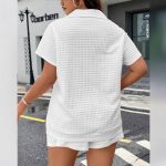 This women’s casual two-piece set includes a finely crafted jacquard top paired with matching shorts. The fabric features an intricate jacquard pattern, offering both texture and visual interest while maintaining breathability and comfort. Designed for casual occasions, the set provides a relaxed fit for ease of movement and all-day wearability. The shorts feature an elastic waistband for adjustable comfort, and the coordinating top complements the look with a refined yet effortless style. Suitable for everyday activities, this ensemble combines style and practicality.