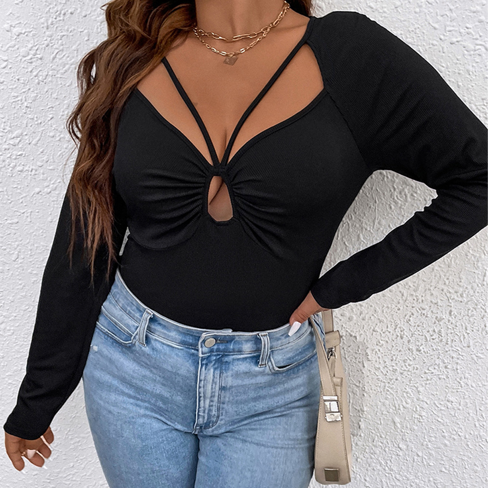 This women’s top features a knitted fabric construction that provides both comfort and a refined appearance. Designed with a unique tie-detail at the front, it adds an element of elegance and femininity. The fold-over neckline complements the long sleeves, enhancing the overall sophisticated style. The hollow-out sections offer subtle allure while maintaining a classy aesthetic, making it suitable for both casual and dressier occasions.