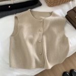 Elegant women’s knitted V-neck vest featuring small gold buttons and a single-breasted design for a refined cardigan top look.