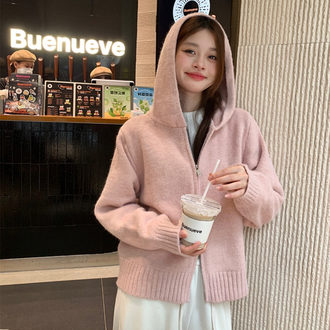 Stylish women’s Korean-style knit base shirt with hood and double zipper, perfect for layering and casual wear.
