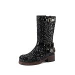 Stylish women’s mid-calf leather boots featuring eye-catching sequin belt buckles for a fashionable and unique look.
