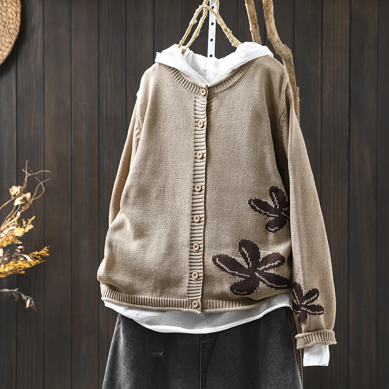 Stylish women’s loose fit cardigan featuring retro floral patterns and contrasting cotton knit fabric for comfortable wear.