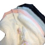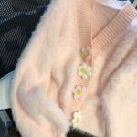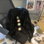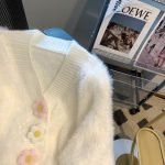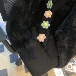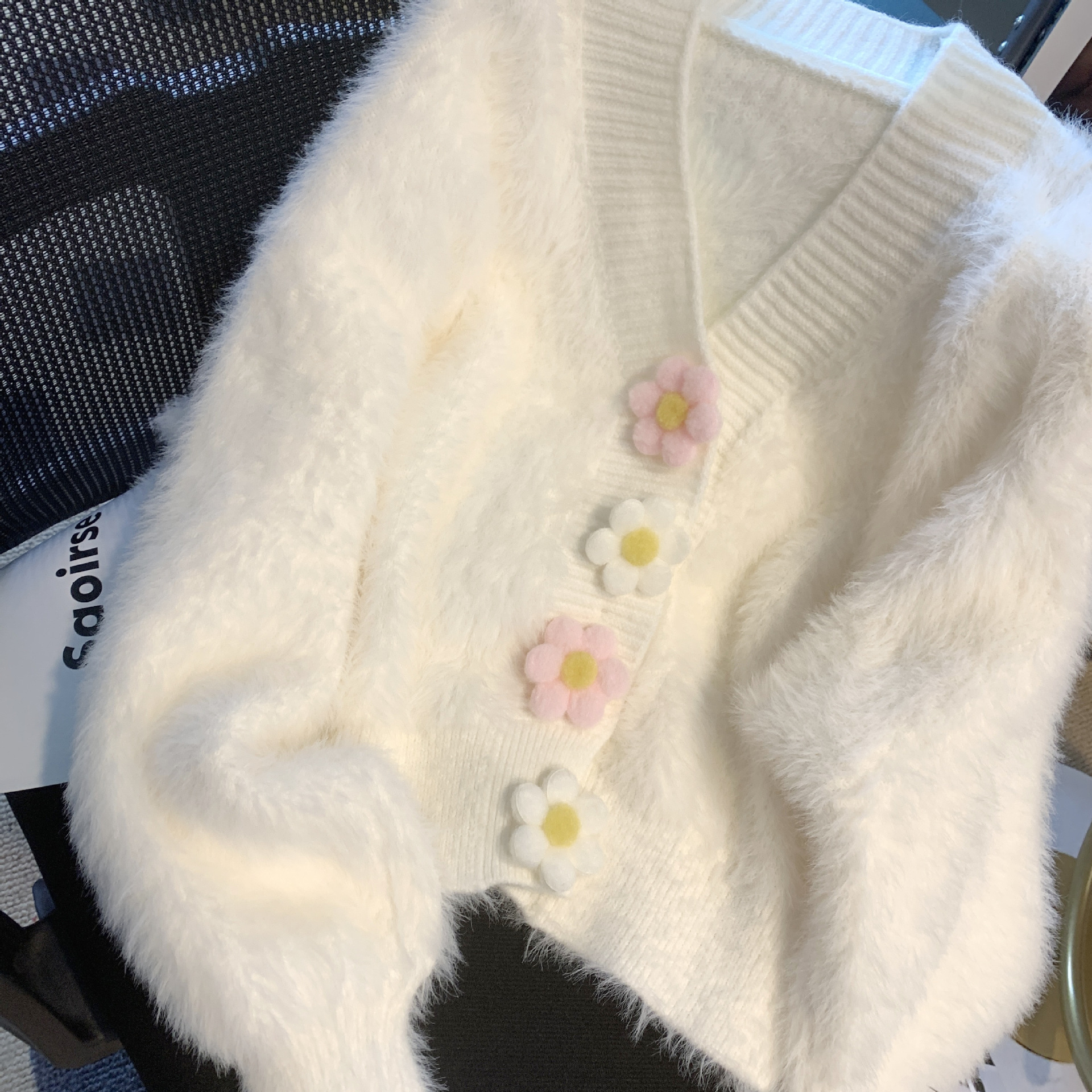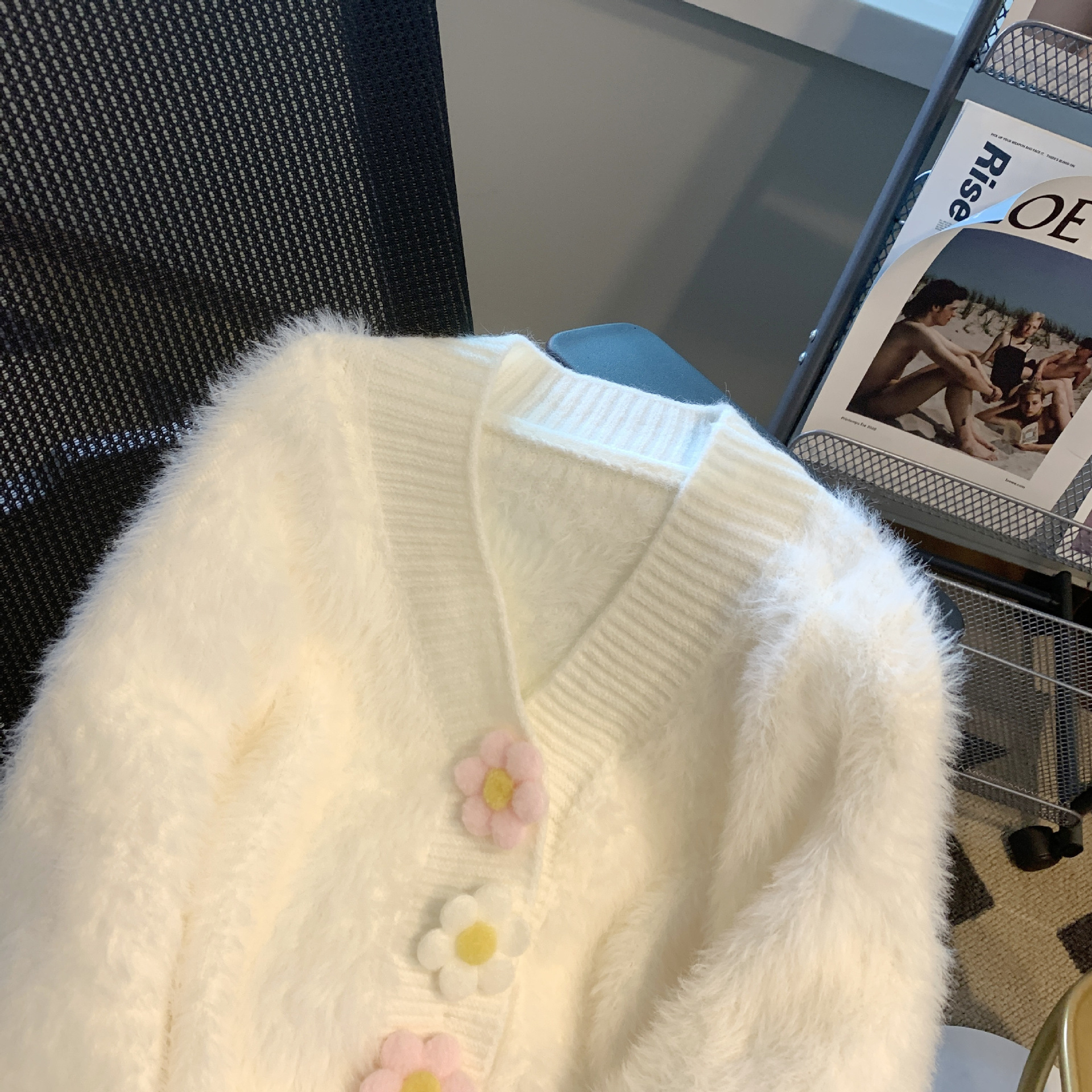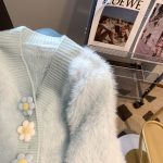 Elegant women’s knitted V-neck sweater coat featuring mink fur trim and three-dimensional flower accents for refined style and comfort.
