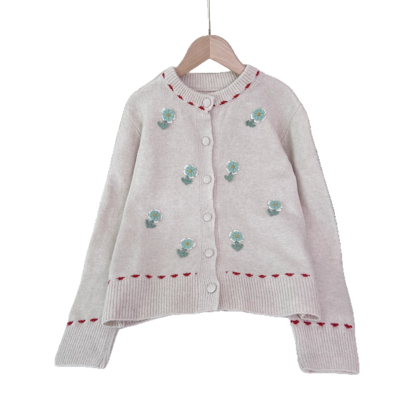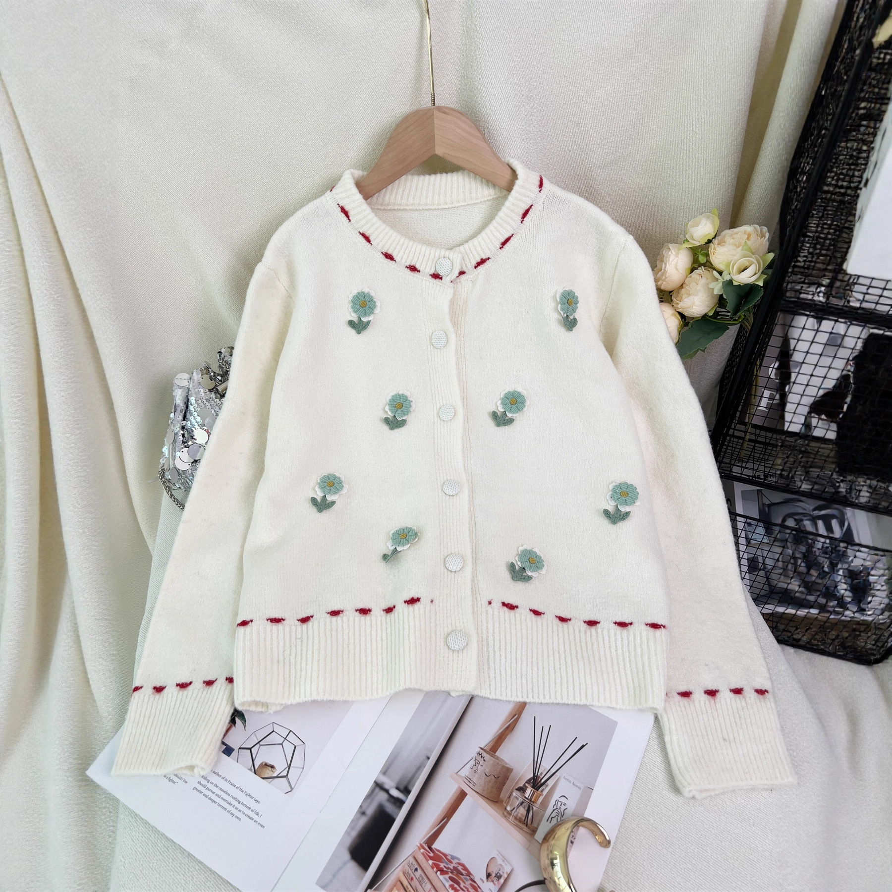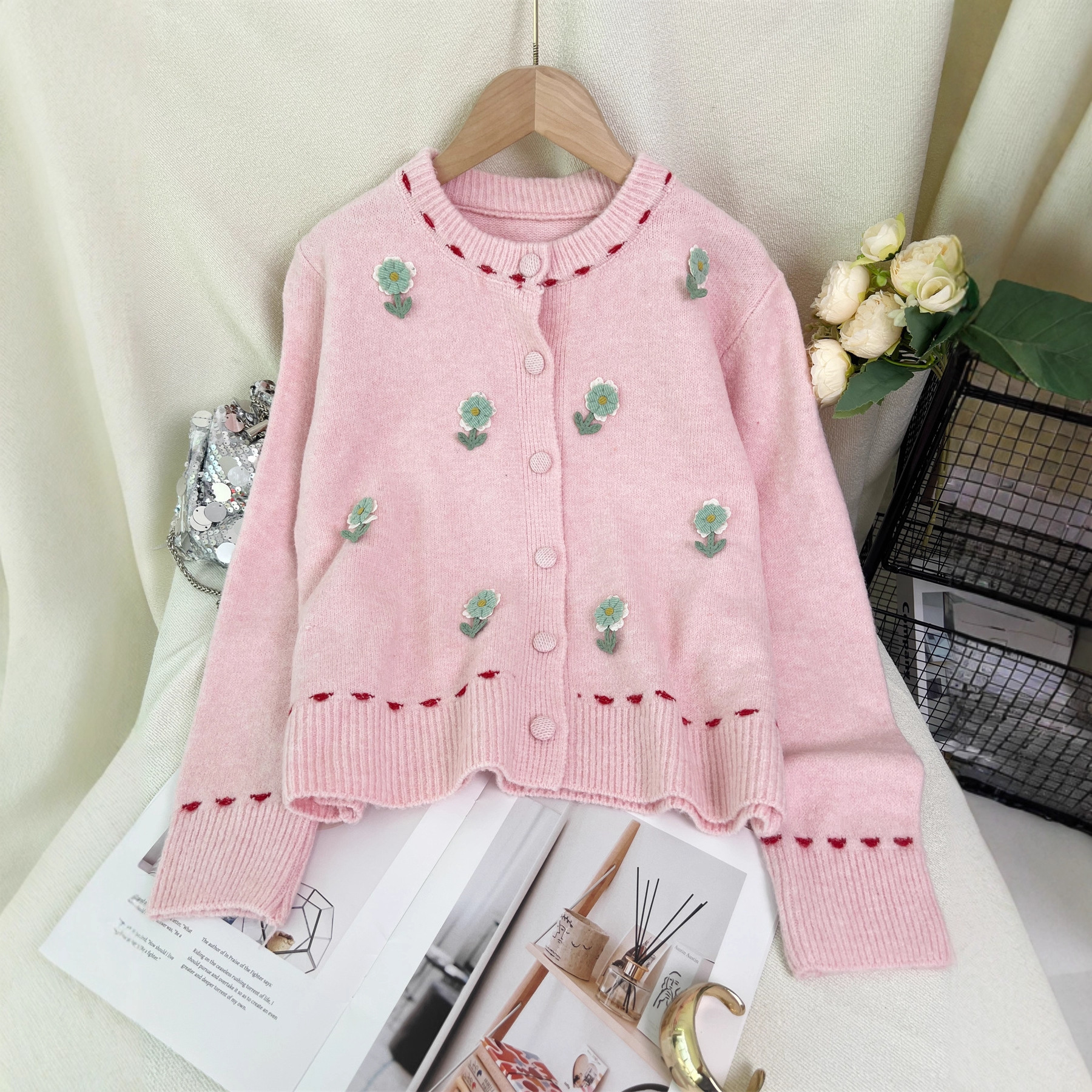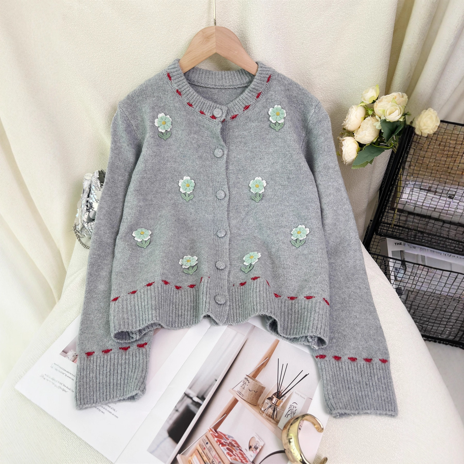 Stylish women’s patchwork flower knitted cardigan featuring a round neck for casual comfort and versatile wear.