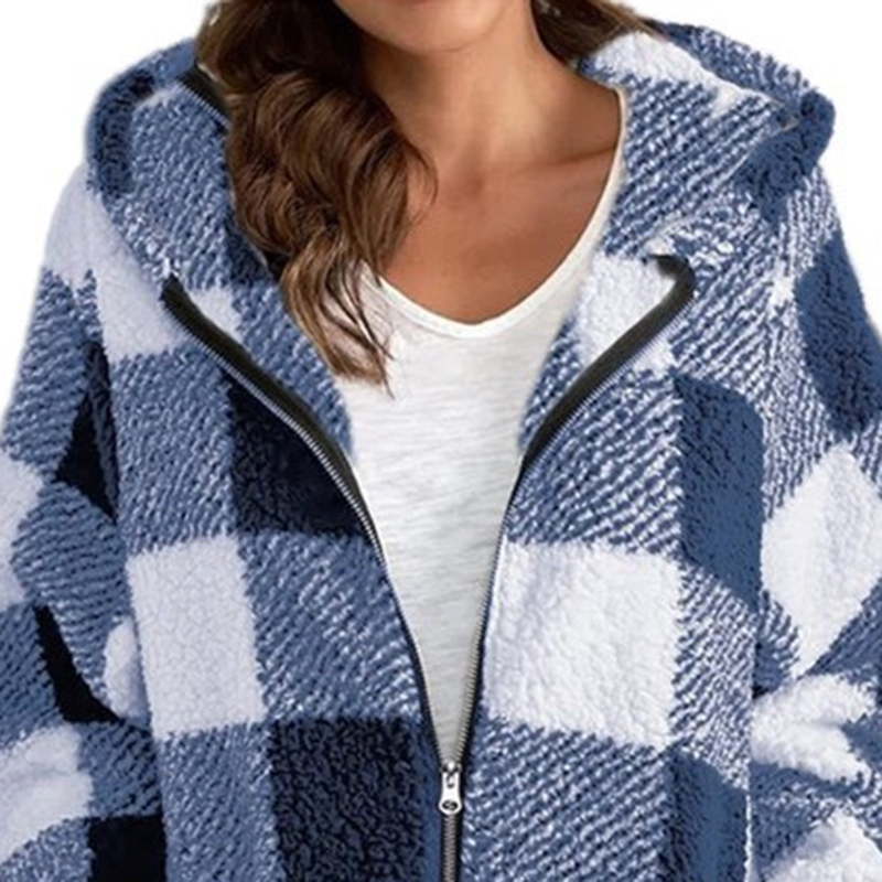 Stylish women’s oversized plaid hooded jacket with zip closure and pockets, perfect for winter casual wear and commuting.