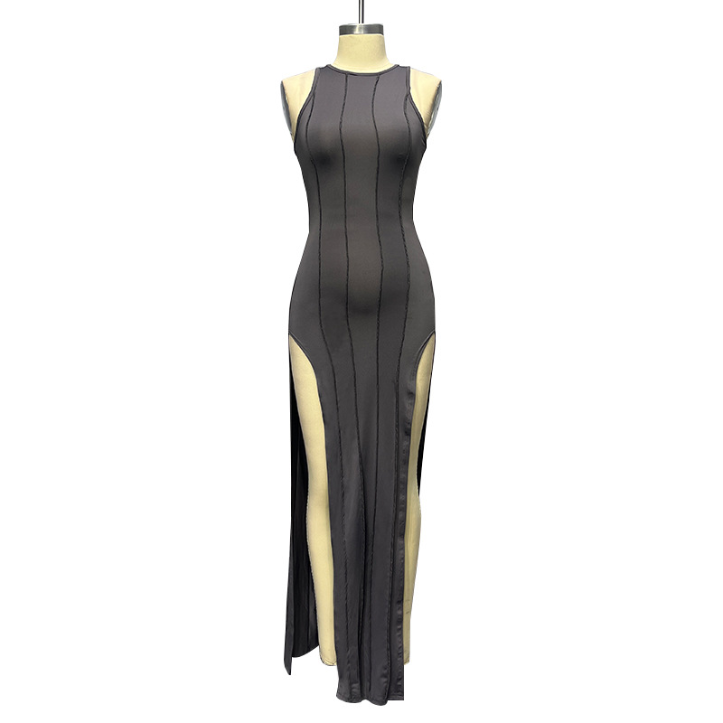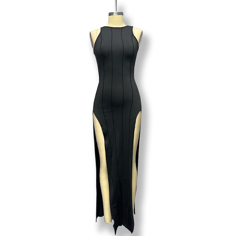 Elegant women’s sleeveless slim dress featuring a round neck and a high slit for a refined, sexy look.