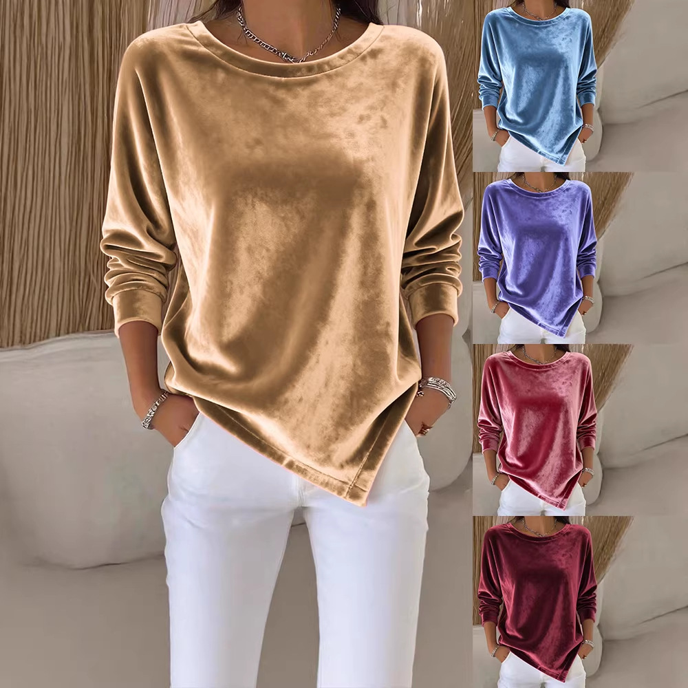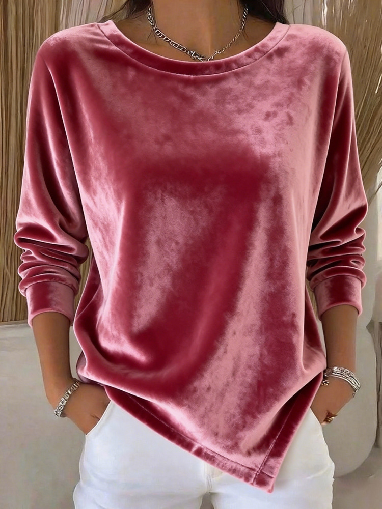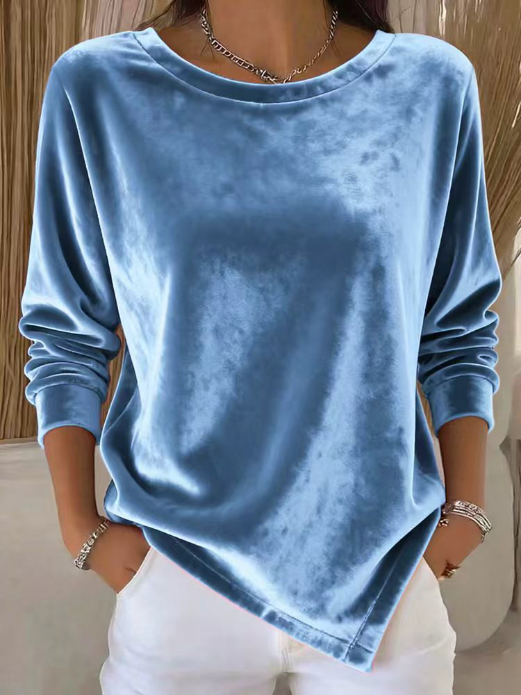 Elegant women’s velvet blouse featuring a round neck and long sleeves in a solid color for a refined, comfortable look.
