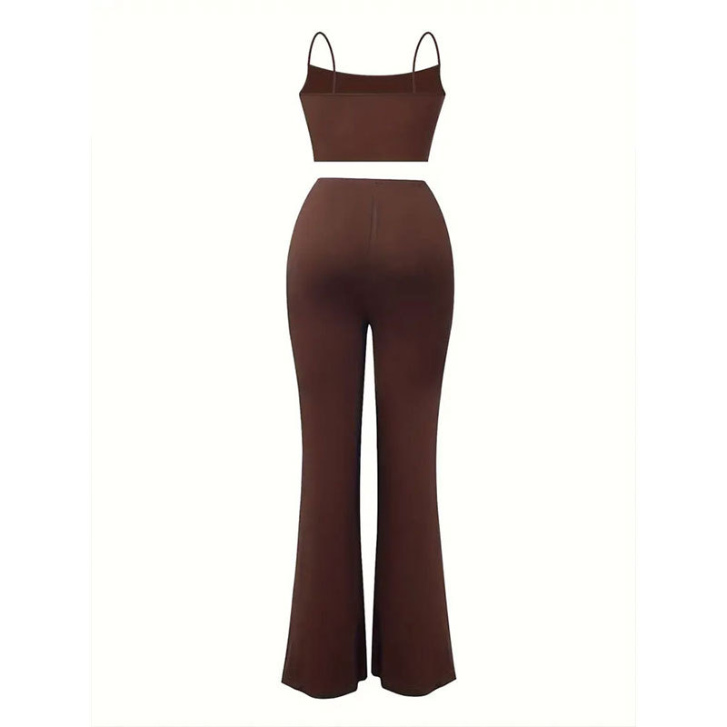 Stylish women’s two-piece set featuring a halter crop top with drawstring front and elegant flared pants for a chic look.