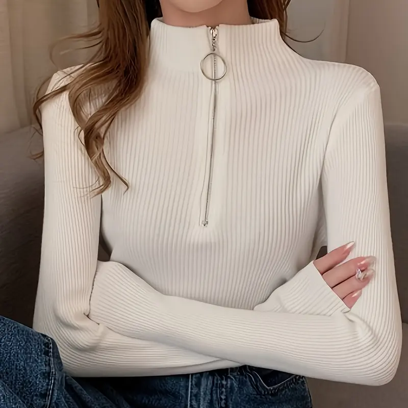 Slim fit women’s half-zip turtleneck sweater with long sleeves, perfect for office and casual winter wear.