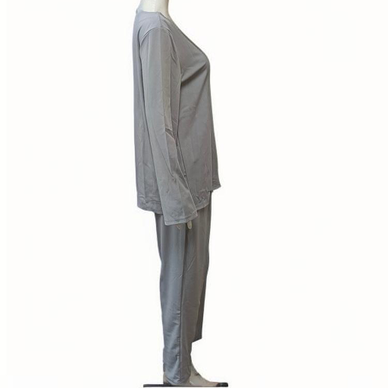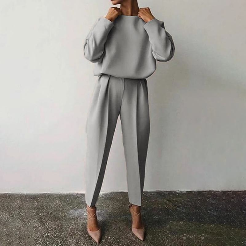 This women’s solid color 2-piece set includes a round neck long sleeve top paired with pleated pants, designed for comfortable loungewear during spring and fall. The set combines a relaxed fit top with a stylish pleated pant, offering both ease of movement and elegant casual style. Crafted from soft, breathable fabric, it provides all-day comfort and versatility for various casual occasions. The minimalist design allows for effortless coordination, making it a practical addition to any seasonal wardrobe.