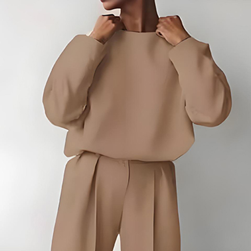 Comfortable women’s 2-piece loungewear set featuring a round neck long sleeve top and pleated pants, ideal for spring and fall seasons.