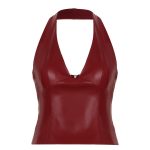 Stylish women’s leather halter vest featuring a solid color, V-neck design, and convenient back zipper closure for a sleek fit.