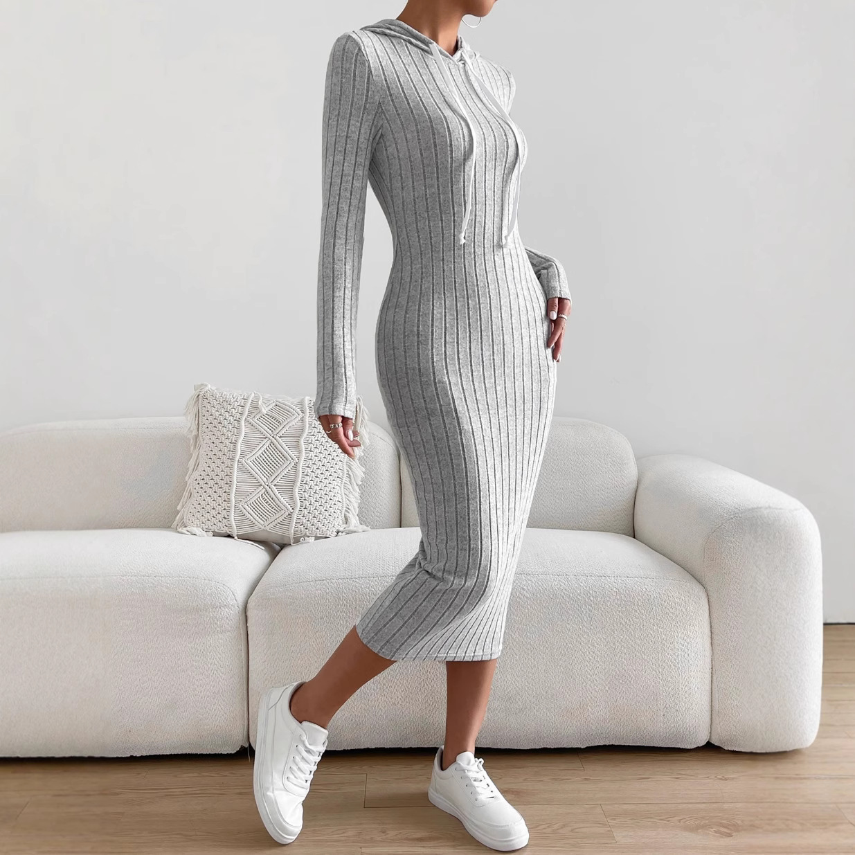 Elegant women’s solid color hooded knit long dress offering comfort and style for casual and semi-formal occasions.