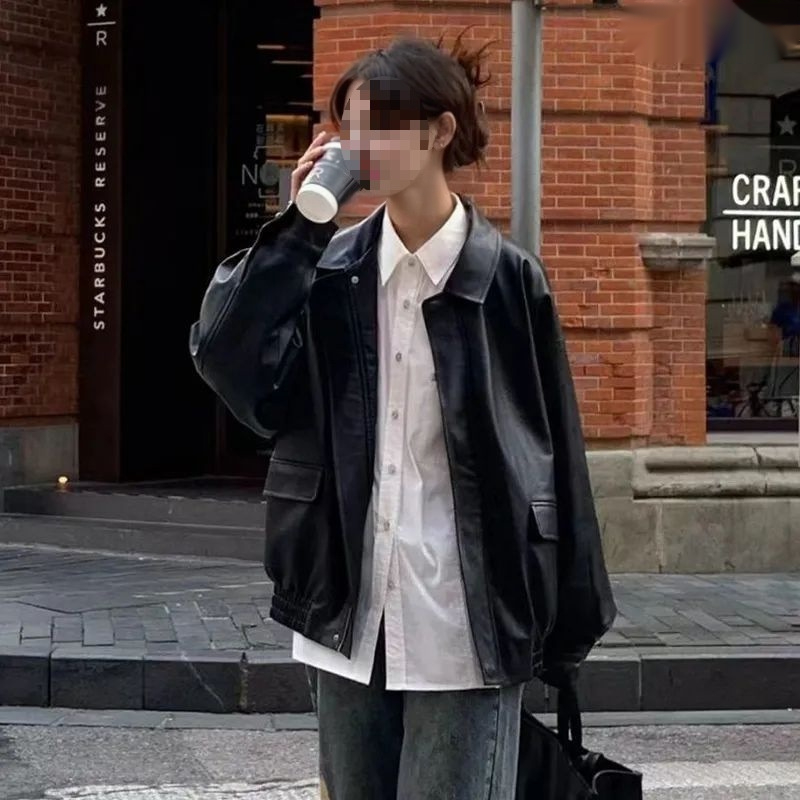 Classic retro black leather motorcycle jacket for women, designed for spring and fall with a loose, comfortable fit.