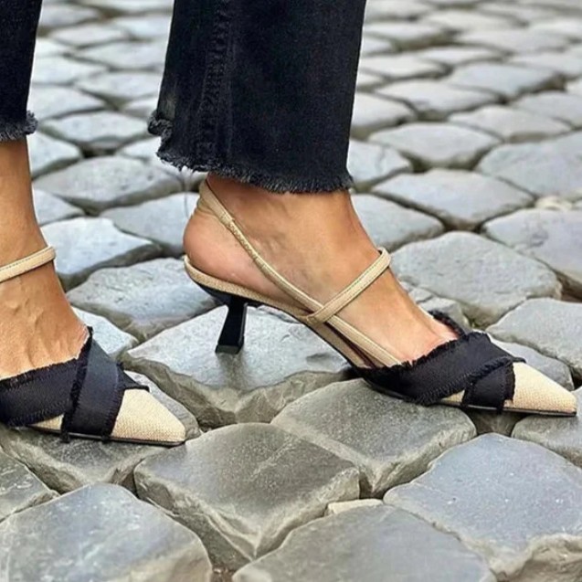 Elegant women’s stiletto sandals with color block design and pointed toe, perfect for stylish and formal occasions.