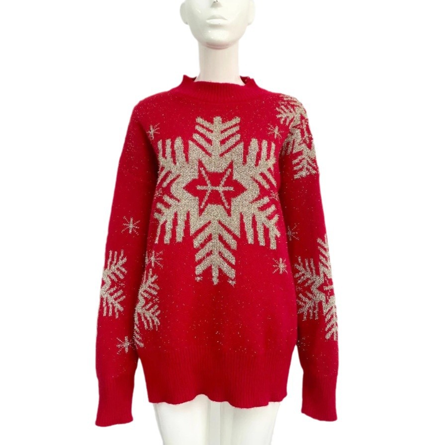 Elegant women’s loose-fitting sweater with gold thread snowflake jacquard and half turtleneck, perfect for stylish winter wear.