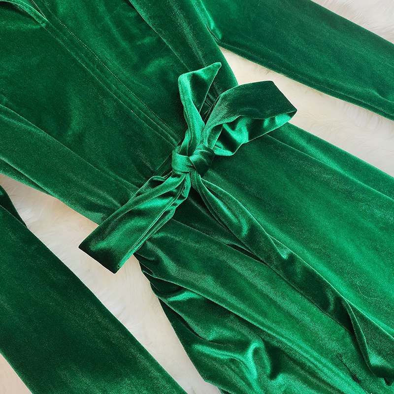 Elegant women’s velvet maxi dress featuring long sleeves, a lapel V-neckline, and a waist belt—perfect for casual fall wear.