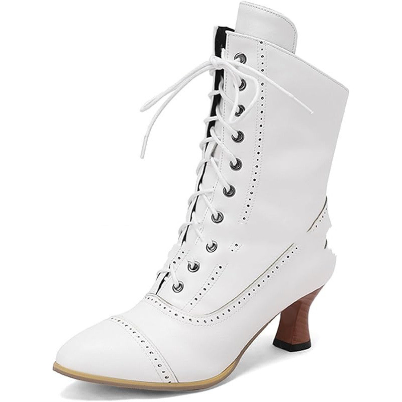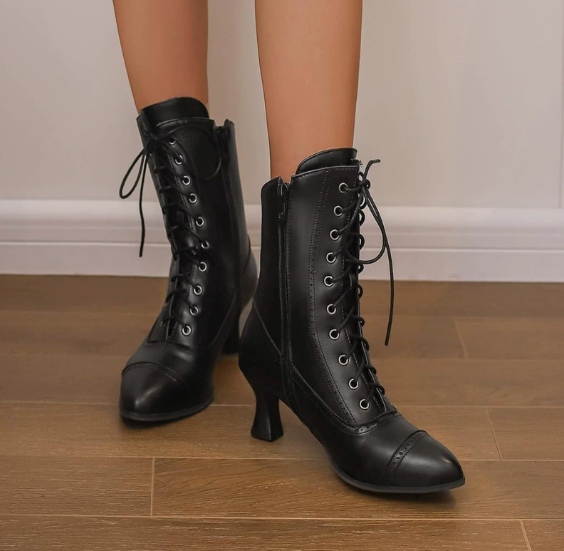 Elegant women’s vintage granny ankle boots featuring Renaissance-style design, low heels, lace-up front, and convenient side zippers.