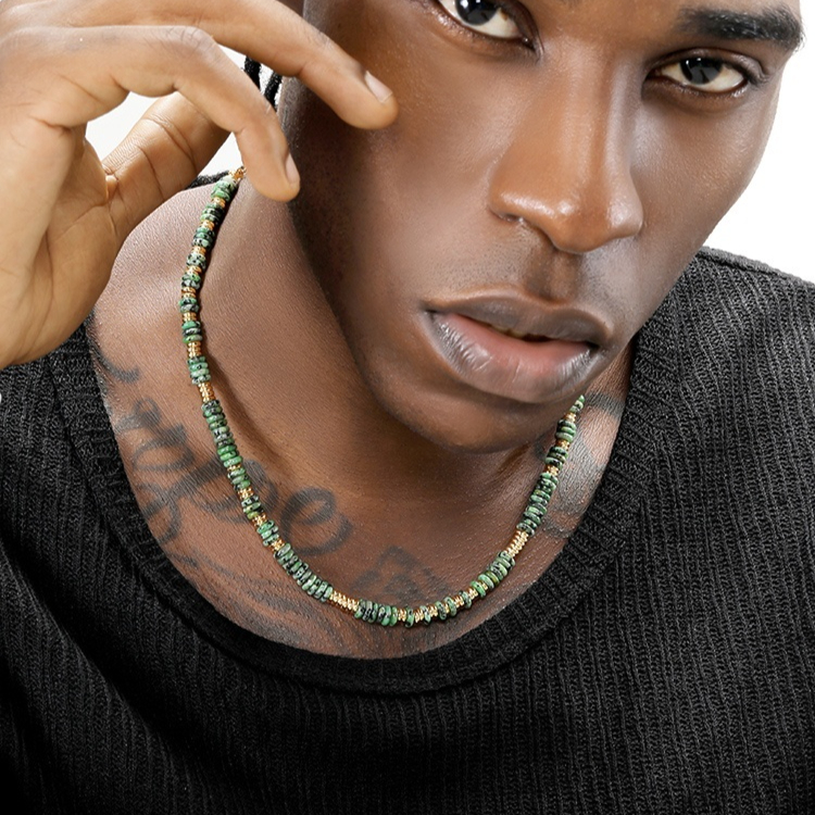 This women’s necklace showcases a vintage design with speckled green stones meticulously arranged among finely crafted beads. The combination of earthy green hues and textured beads creates a distinctive accessory that complements both casual and formal attire. Designed for comfort and style, this necklace adds a classic touch to any ensemble, emphasizing timeless elegance and artisanal craftsmanship.