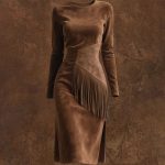This women’s maxi dress embodies vintage western style, crafted from suede-look fabric that offers a luxurious texture. The gown features distinctive boho fringe along the sleeves and hem, adding dynamic movement and a rustic flair. The waist is accentuated with subtle ruffle detailing that enhances the bodycon fit, creating an elegant and flattering silhouette. Designed for both comfort and style, this dress is perfect for occasions that call for a unique blend of classic and contemporary fashion elements.