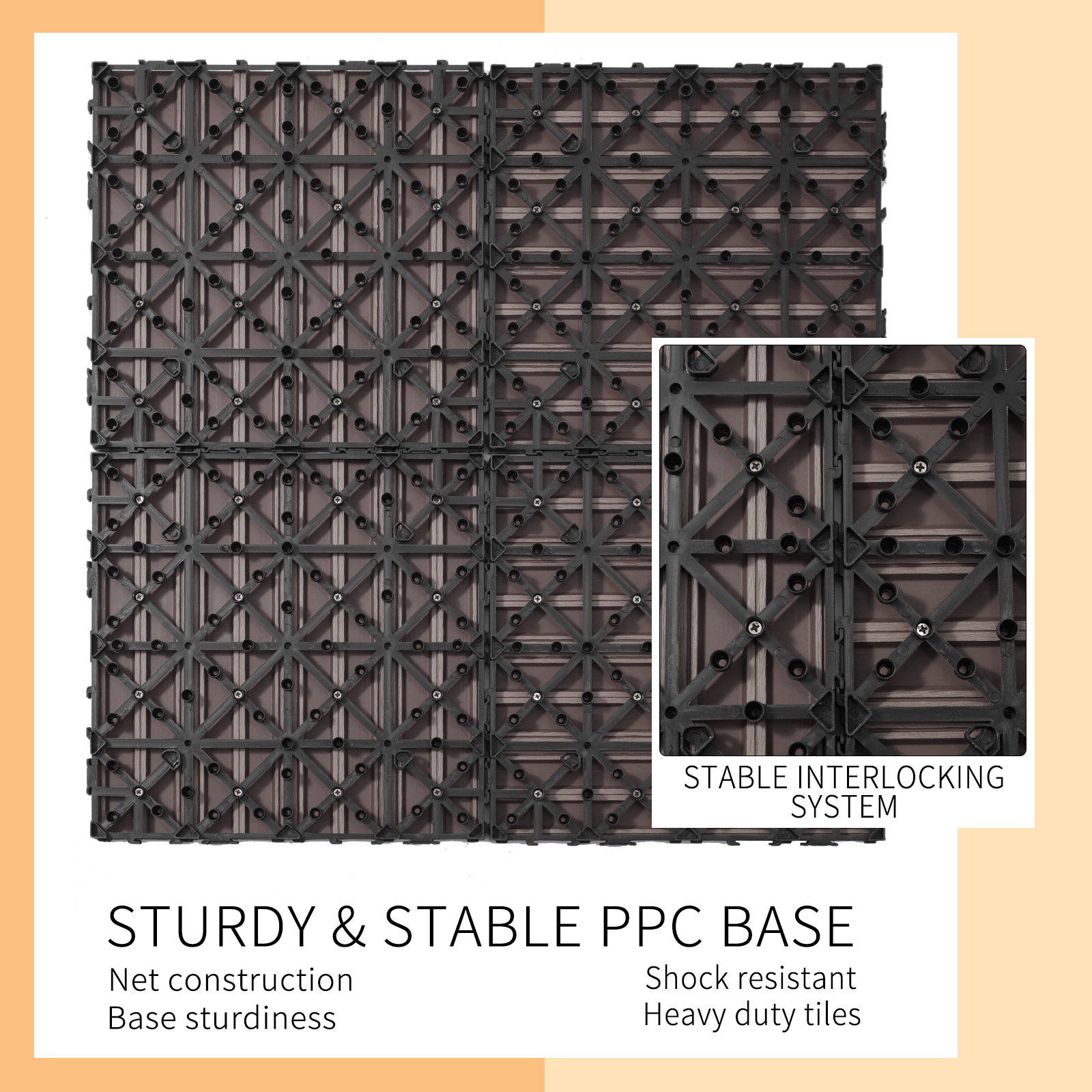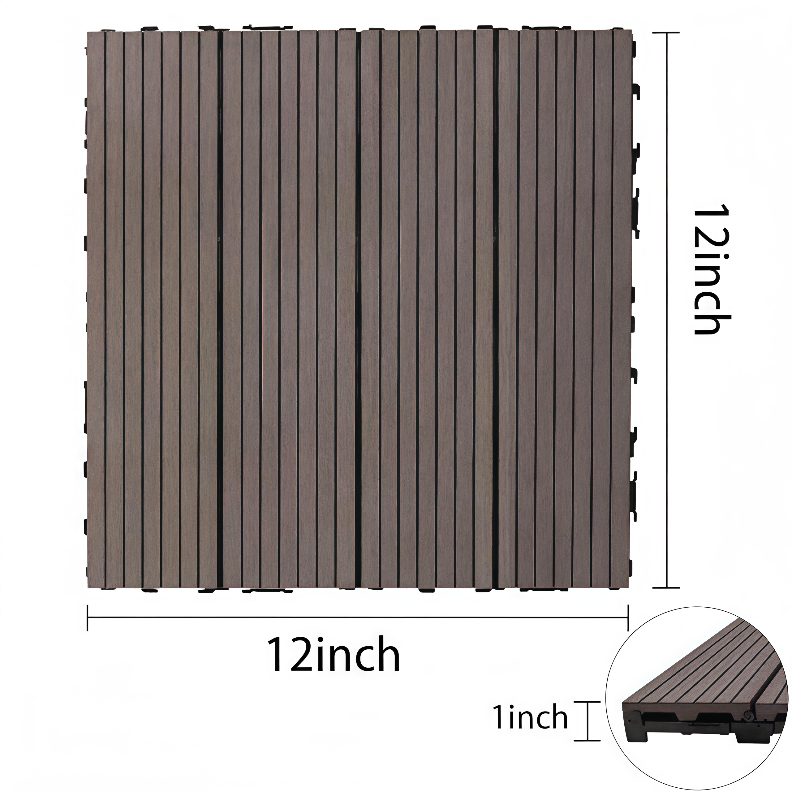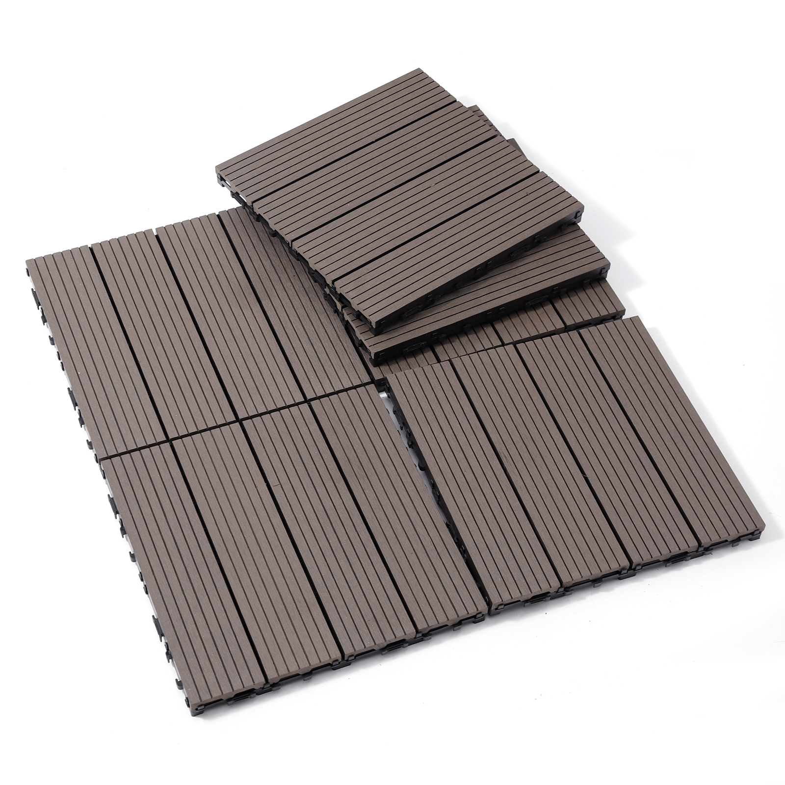 This set of 20 wood plastic composite deck tiles offers a sustainable and durable solution for outdoor flooring. Crafted from FSC-certified composite material, these tiles resist rust, water, and adverse weather conditions, ensuring long-lasting performance. The light coffee color complements various outdoor decors, enhancing patios, balconies, and rooftop spaces. Designed for easy DIY installation and low maintenance, these deck tiles provide a versatile and eco-friendly option for creating stylish, weather-resistant outdoor surfaces.