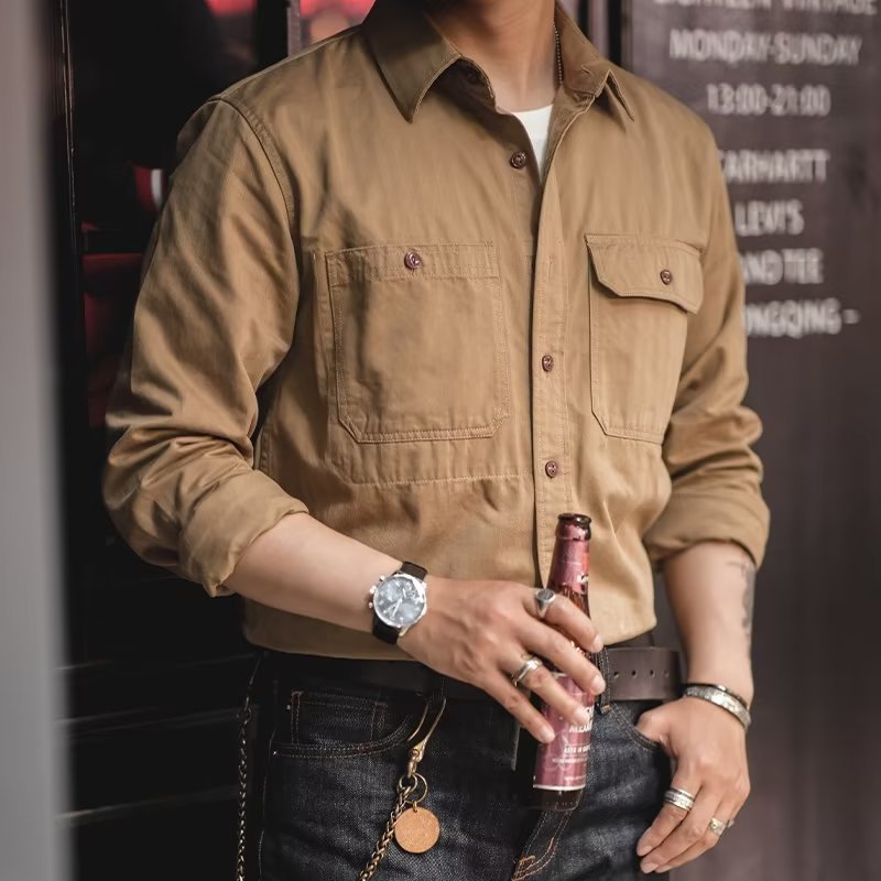Durable men’s Amekaji lapel workwear shirt with long sleeves, combining vintage style with practical comfort for everyday wear.