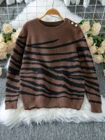 Stylish zebra print sweater featuring a round neck, shoulder button accents, and long sleeves for comfortable, fashionable wear.